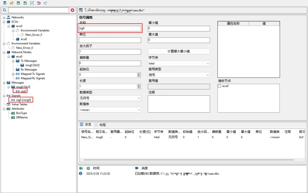 ▲ 修改CAN信号名称。点击【Signals】下的信号节点/【Messages】下报文中的信号节点,在属性编辑区找到【名称】输入框,输入sig0并回车。对于该界面其它的属性字段,也可以类似的方式修改。