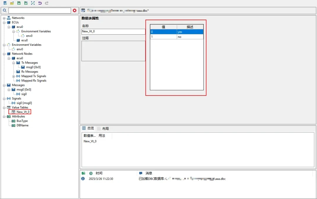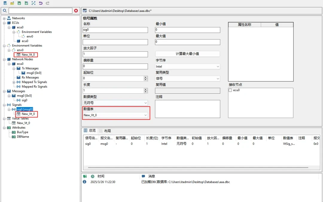 步骤4:为信号/环境变量添加数值表。点击信号或者环境变量节点,在属性编辑区找到【数值表】下拉框,选择New_Vt_0。