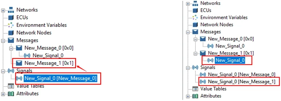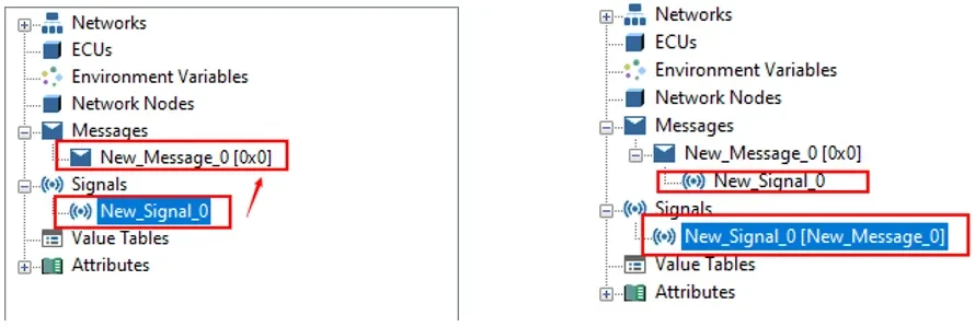 ▲ 信号拖拽到报文,如下图所示,将信号New_Signal_0拖拽到New_Message_0时,会将信号New_Signal_0添加到New_Message_0下。