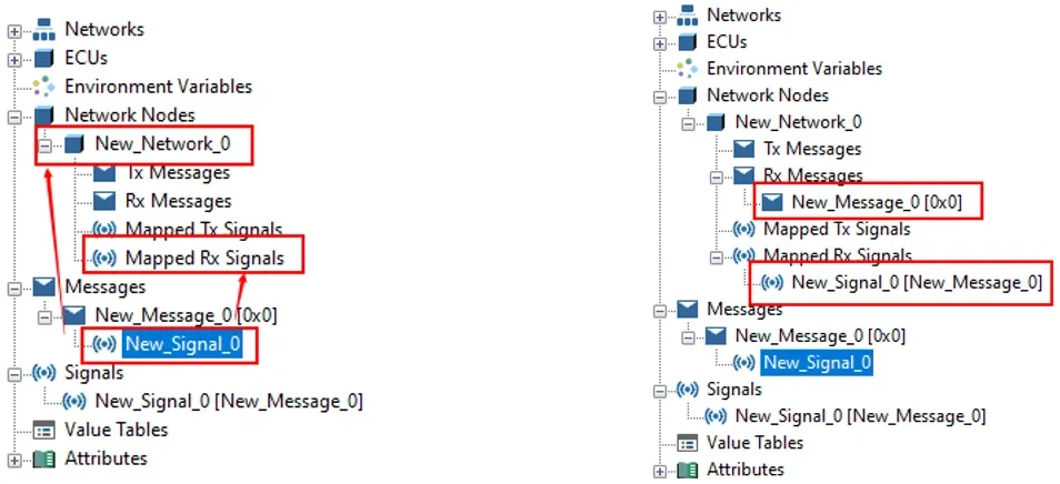 ▲ 信号拖拽到节点,如下图所示,将信号New_Messages_0下的New_Signal_0信号拖拽到New_Network_0或者其下的【Mapped Rx Signals】时,会将信号New_Signal_0添加到【Mapped Rx Signals】下,New_Messages_0添加到【Rx Messages】下。