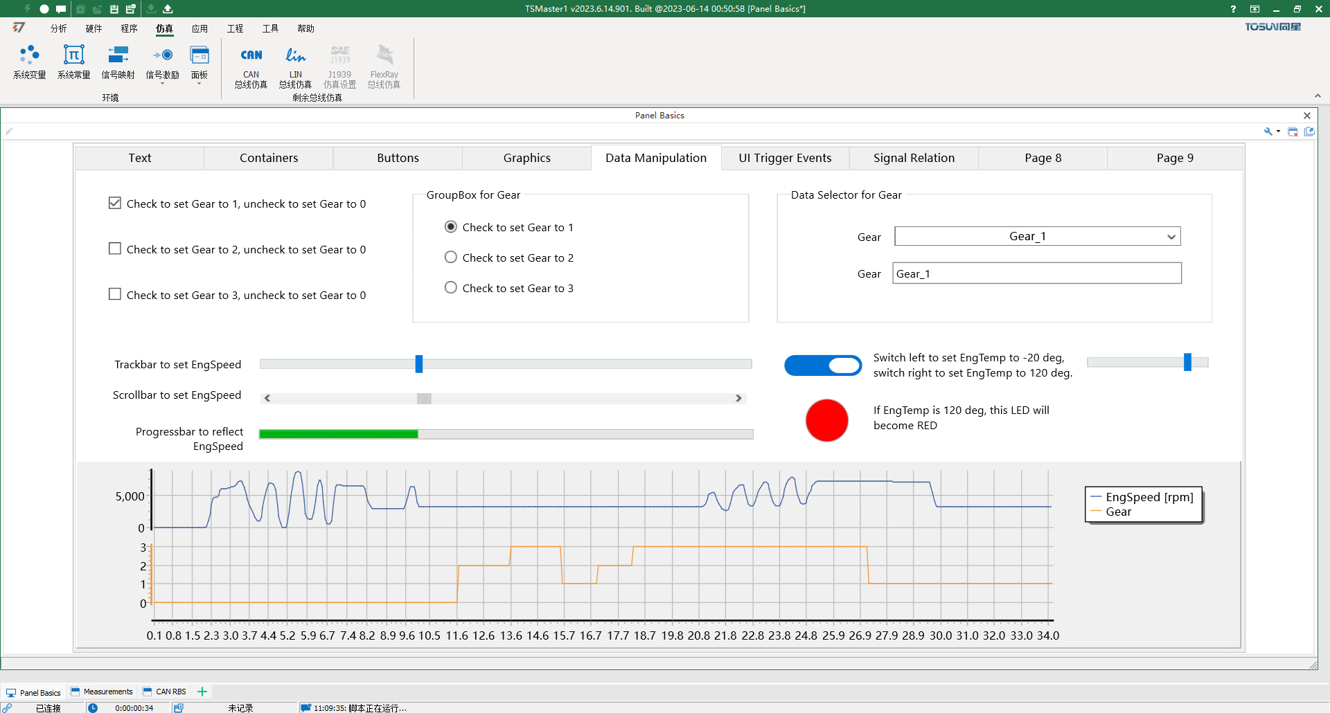 TSMaster内置Panel功能,在面板中可以关联总线信号实现图形化显示,结合RBS仿真也可以控制信号和报文的发送。