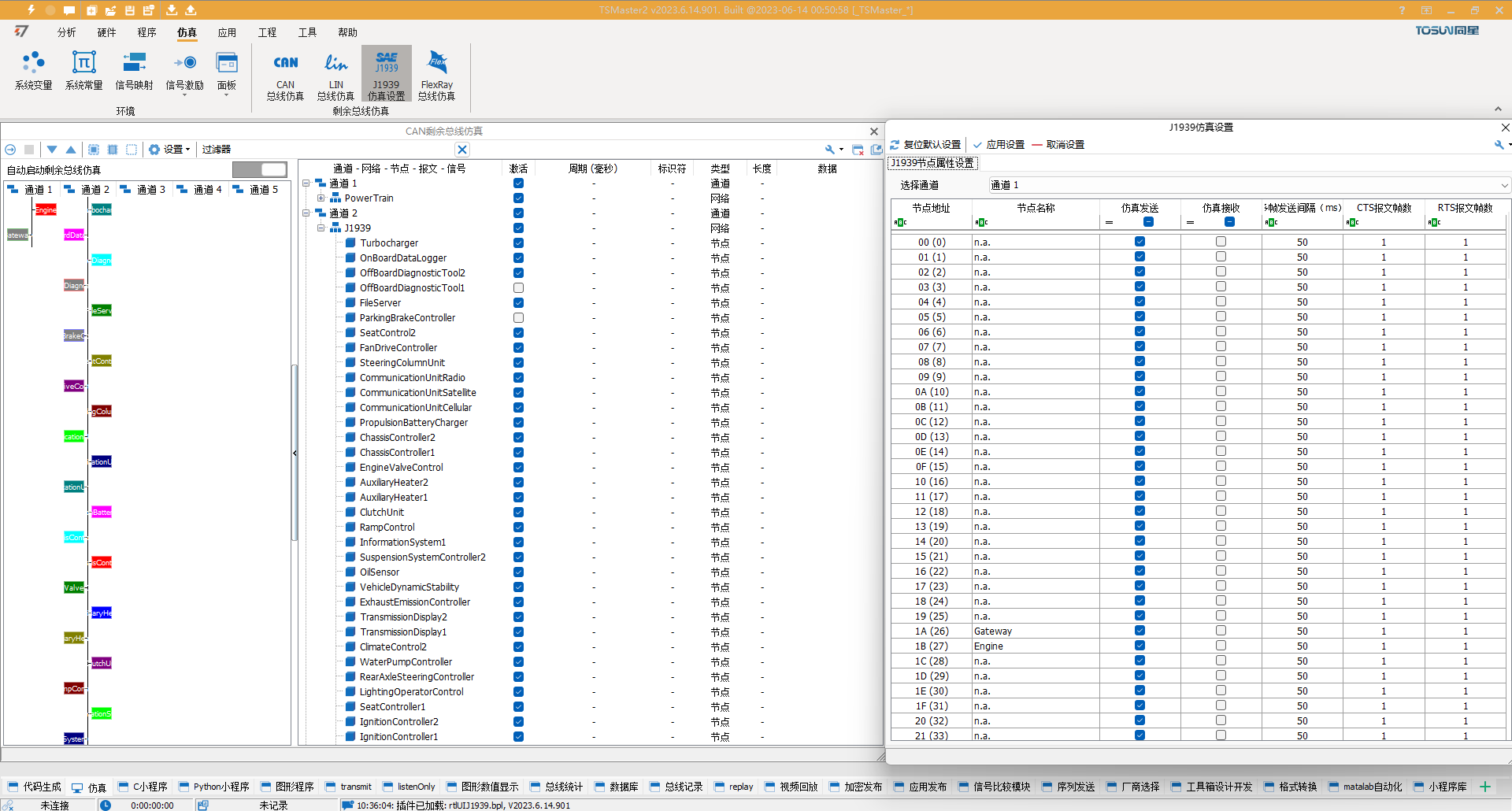 TSMaster支持J1939总线仿真。可以结合TSMaster的报文发送中的信号生成器、C代码小程序等灵活仿真整车网络的通信行为。