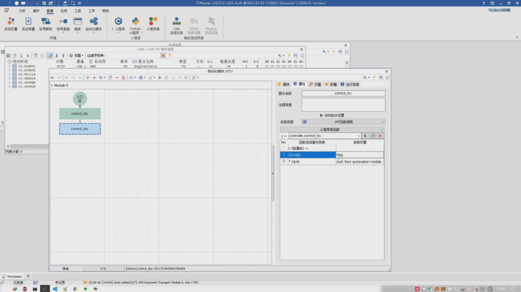 小程序库,有controller这个mp小程序,它有一个API函数。如何验证呢?可以打开一个自动化模块,选中入口点,回车,再双击NOP,到右侧,修改类型为API调用,再修改函数调用类型为小程序库函数,此时会弹出一个函数选择器,第一个函数就是我们刚才设计的control_rbs。选中该函数双击,在右侧填入参数,第一个是使然标志,填入true或者1都可以,第二个是需要打印的信息,比如start from automation module,随后按F9启动,会弹出提示信息。