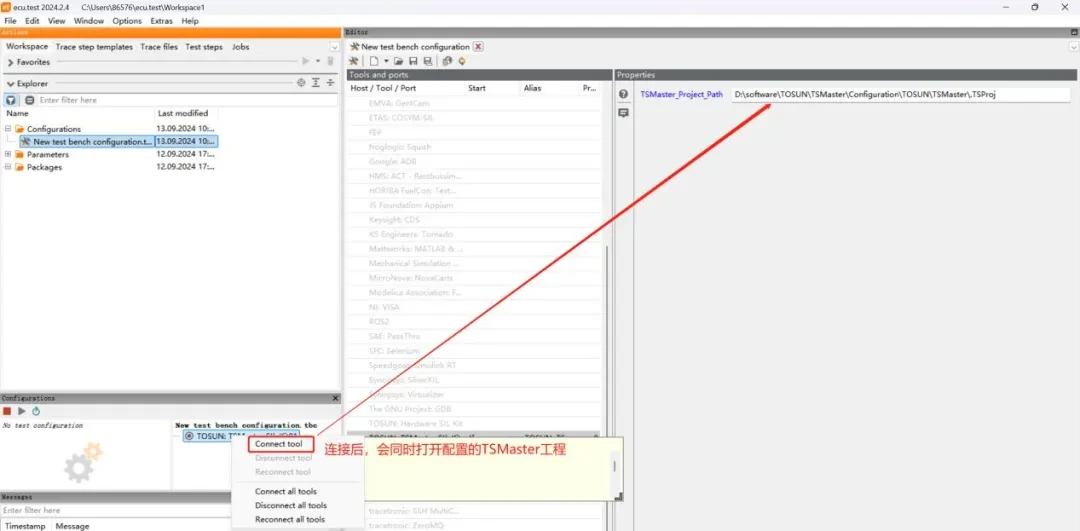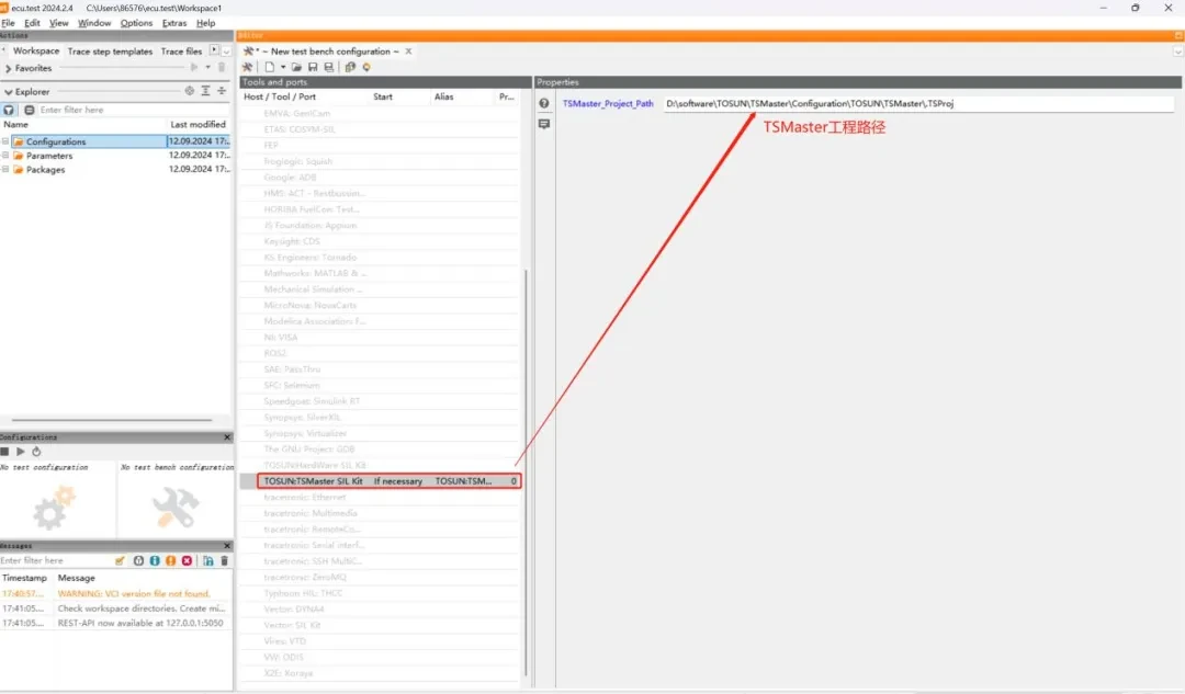 右键“TOSUN: TSMaster SIL Kit”->“Add tool”->“TSMaster_project_path”中填入 TSMaster 的工程路径,点击保存即可。