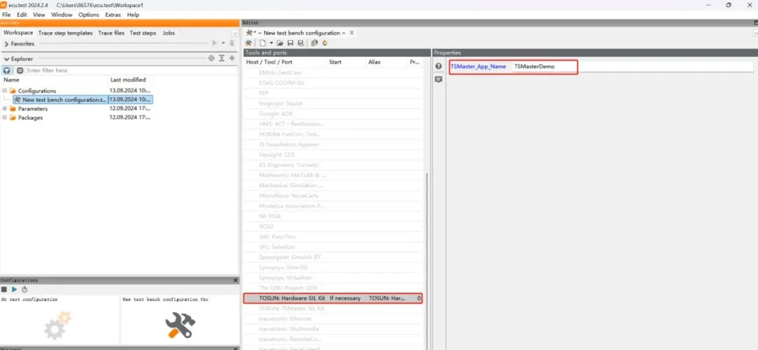 首先创建“test bench configruation”->“new create new tool host”->”Local”;此时就可以在 tool host 窗口中查看到“TOSUN: Hardware SIL Kit”。右键“TOSUN: TSMaster SIL Kit”->“Add tool”->“TSMaster_App_Name”中填入 TSMaster 的应用程序名,点击保存即可。