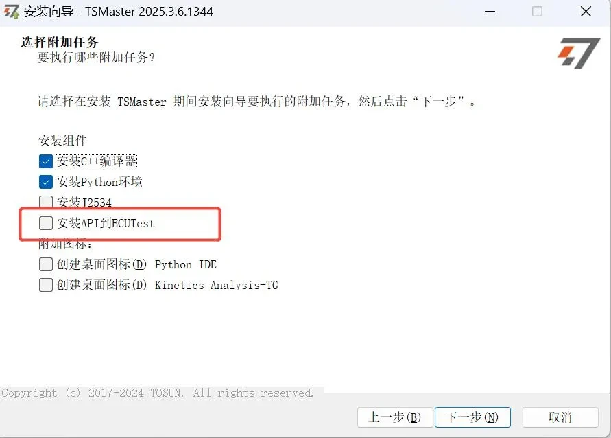 TOSUN 官方即将在安装 TSMaster 时,提供 ECUTEST 插件环境,由用户选择是否安装该插件,与安装 C++\Python 环境同样的方式进行勾选安装。