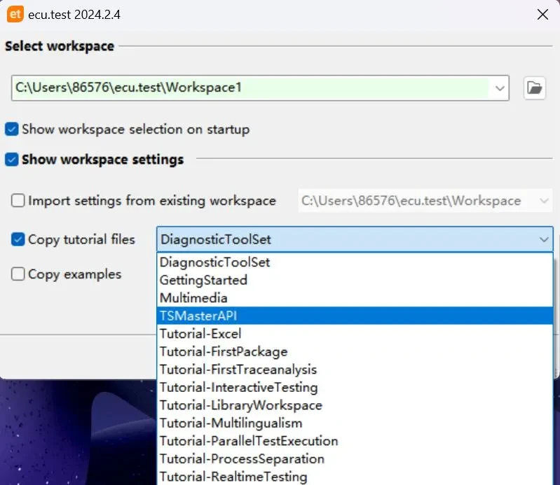 用户在创建 ECUTEST workspace 时,勾选“Show workspace settings”->“Copy tutorial files”->下拉框选择“TSMasterAPI”->“OK”,即可在工作区中查看到“TSOUN: TSMaster SIL Kit”与“TSOUN: Hardware SIL Kit”。
